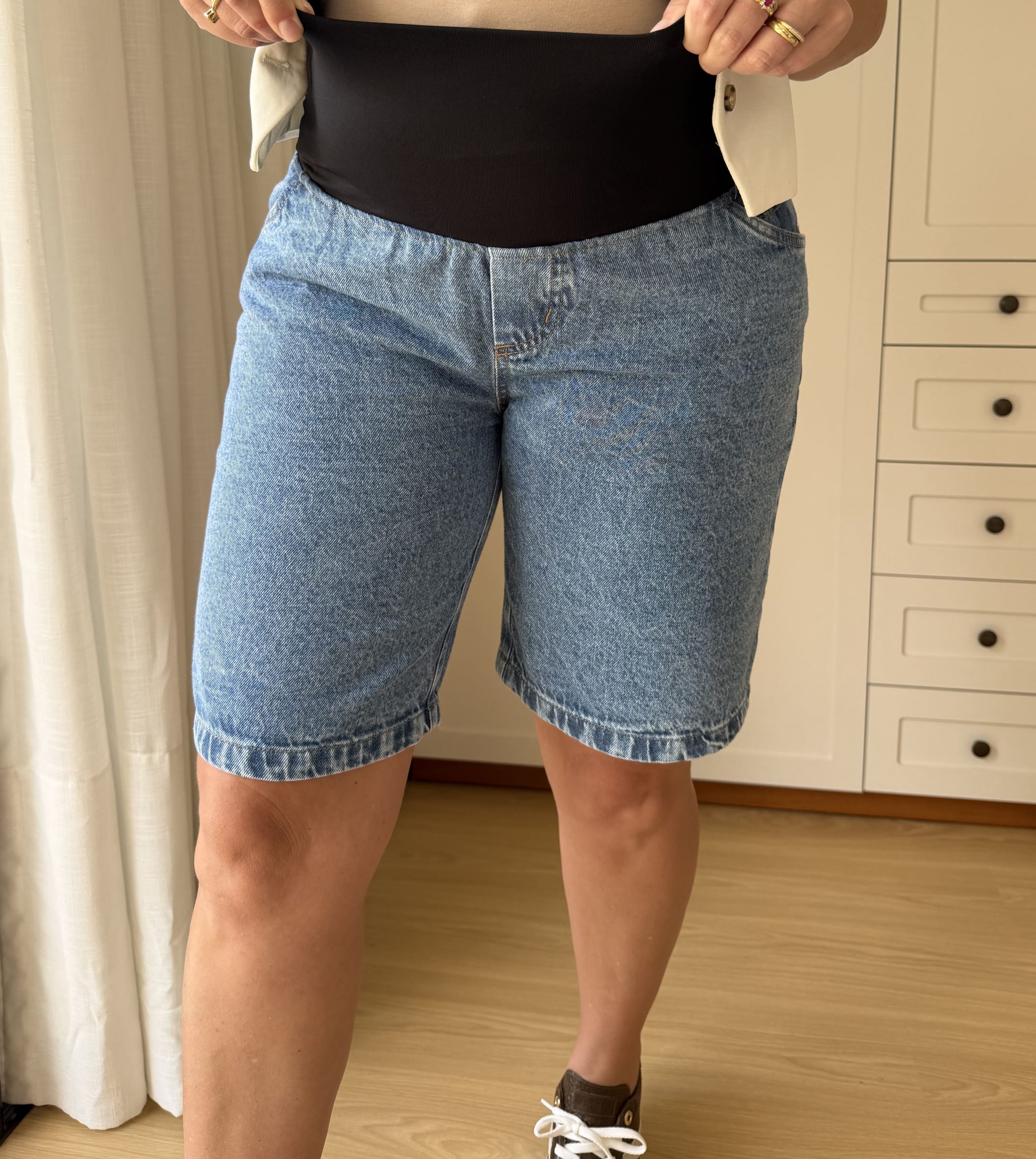 A Bermuda Gestante Jeans foi desenvolvida para acompanhar o crescimento da barriga com muito estilo. Possui cós anatômico em elástico, que se ajusta perfeitamente ao corpo sem apertar, garantindo máximo conforto em todas as fases da gestação.