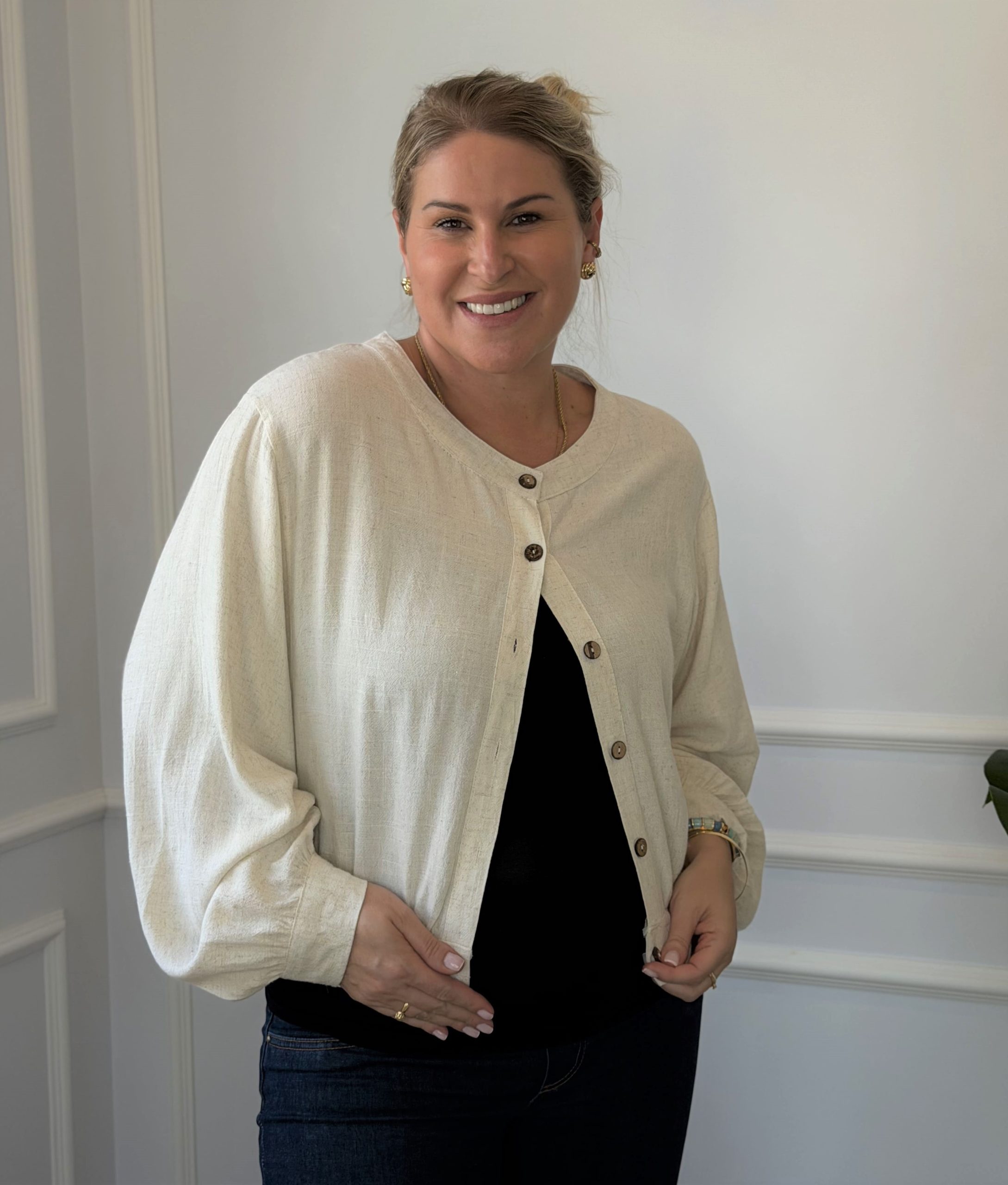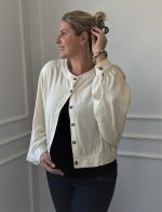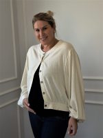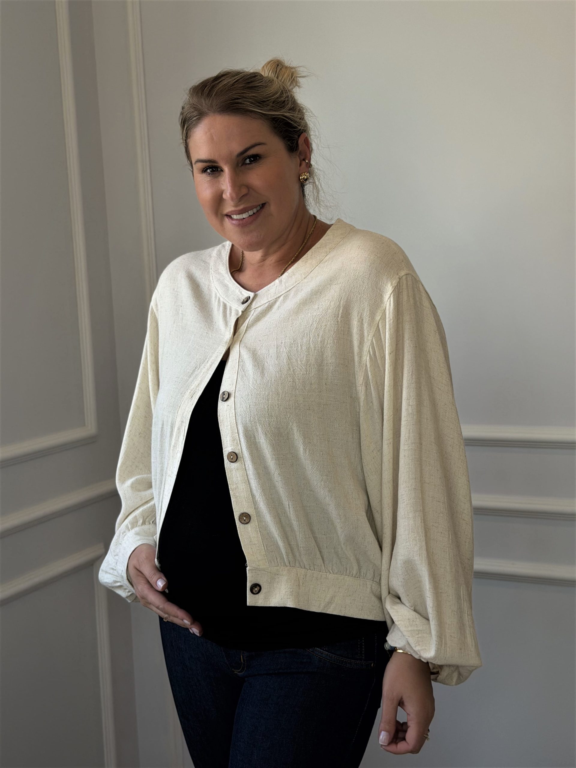 Seu design moderno conta com comprimento cropped, que valoriza a silhueta e acompanha as mudanças do corpo com elegância. As mangas longas amplas trazem um toque sofisticado e garantem liberdade de movimento, enquanto o fechamento frontal com botões de coco adiciona um detalhe natural e delicado à peça.