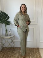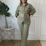 A calça possui cós com elástico e amarração, permitindo ajustar facilmente conforme o crescimento da barriga, garantindo segurança e conforto no dia a dia. Já a camisa conta com bolsos frontais funcionais e botões dourados, que adicionam um toque moderno e elegante à peça.