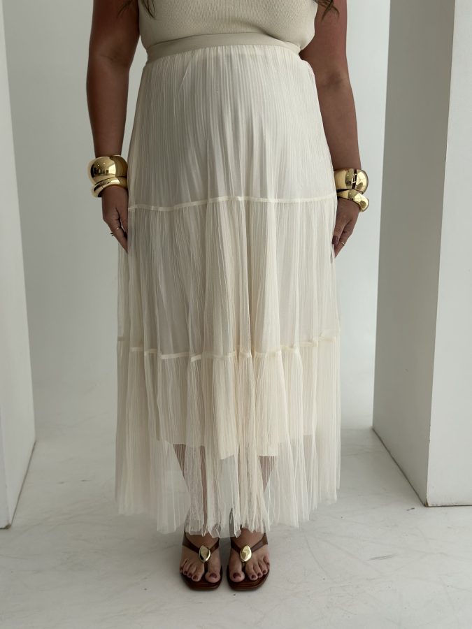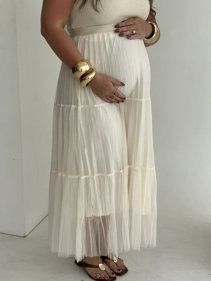 A Saia Gestante Sabrina é a peça perfeita para quem busca leveza, charme e conforto durante a gestação. Confeccionada em tule delicado com comprimento midi, ela traz um caimento fluido e elegante para diferentes ocasiões — desde ensaios fotográficos até eventos especiais.