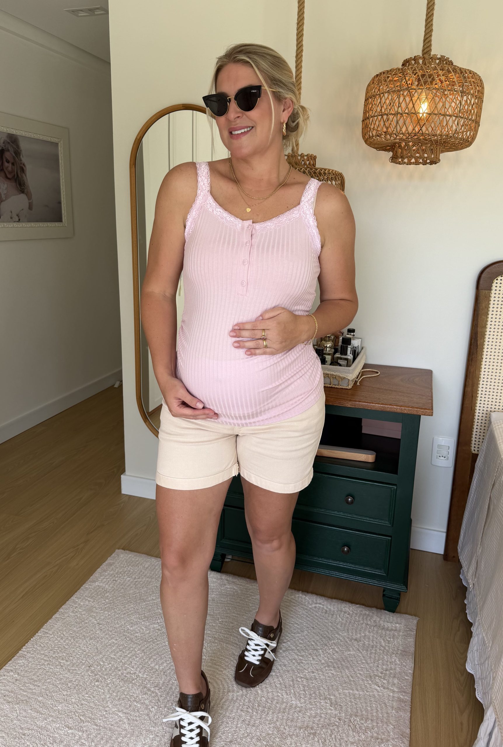 O Shorts Gestante Bege com Cós Anatômico foi desenvolvido especialmente para acompanhar o crescimento da barriga, proporcionando ajuste perfeito e bem-estar no dia a dia. O cós anatômico em tecido maleável se adapta ao corpo sem apertar, oferecendo sustentação e liberdade de movimento.
