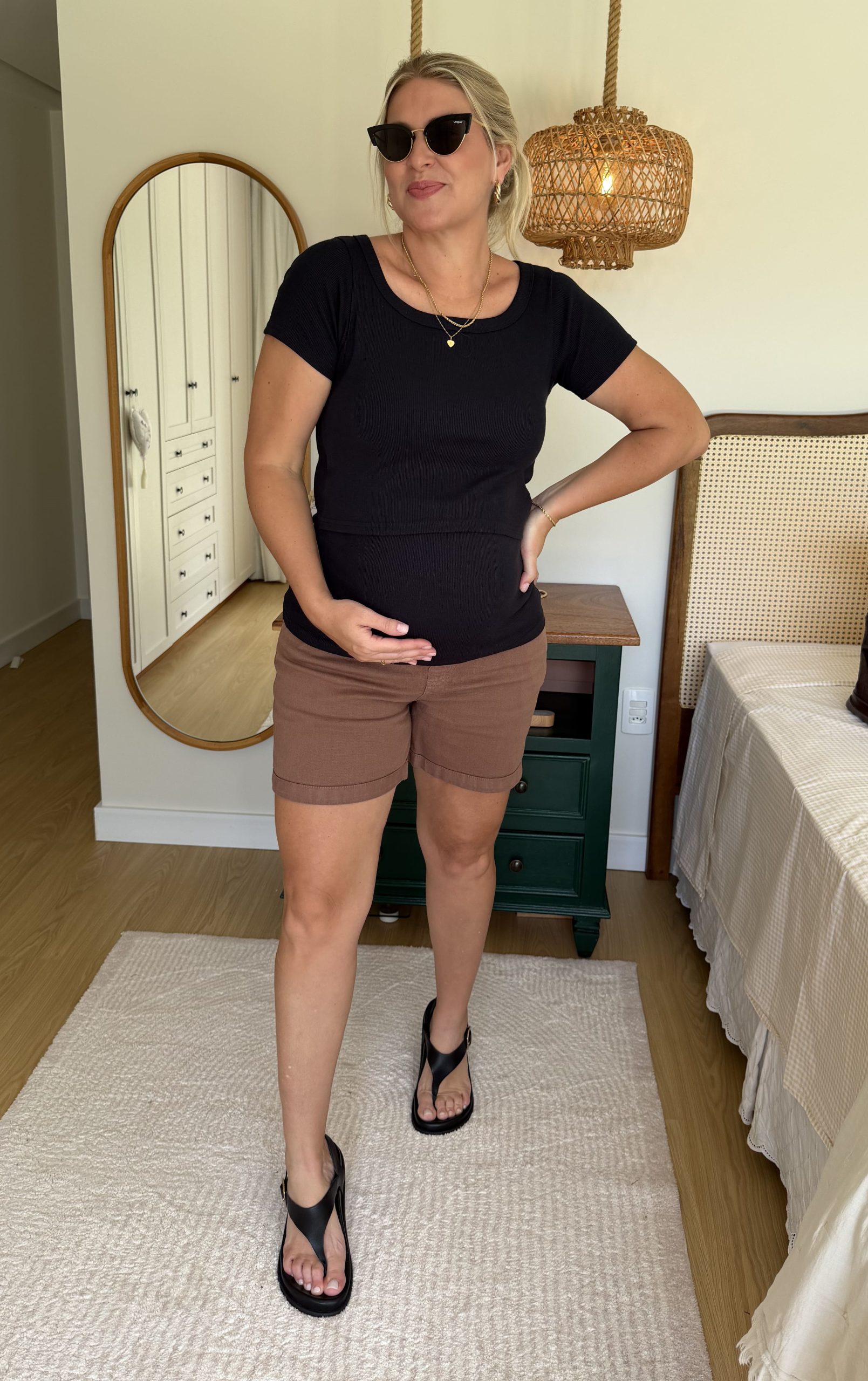 O Shorts Gestante marrom com Cós Anatômico foi desenvolvido especialmente para acompanhar o crescimento da barriga, proporcionando ajuste perfeito e bem-estar no dia a dia. O cós anatômico em tecido maleável se adapta ao corpo sem apertar, oferecendo sustentação e liberdade de movimento.