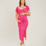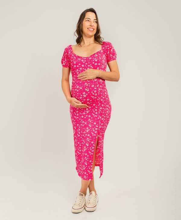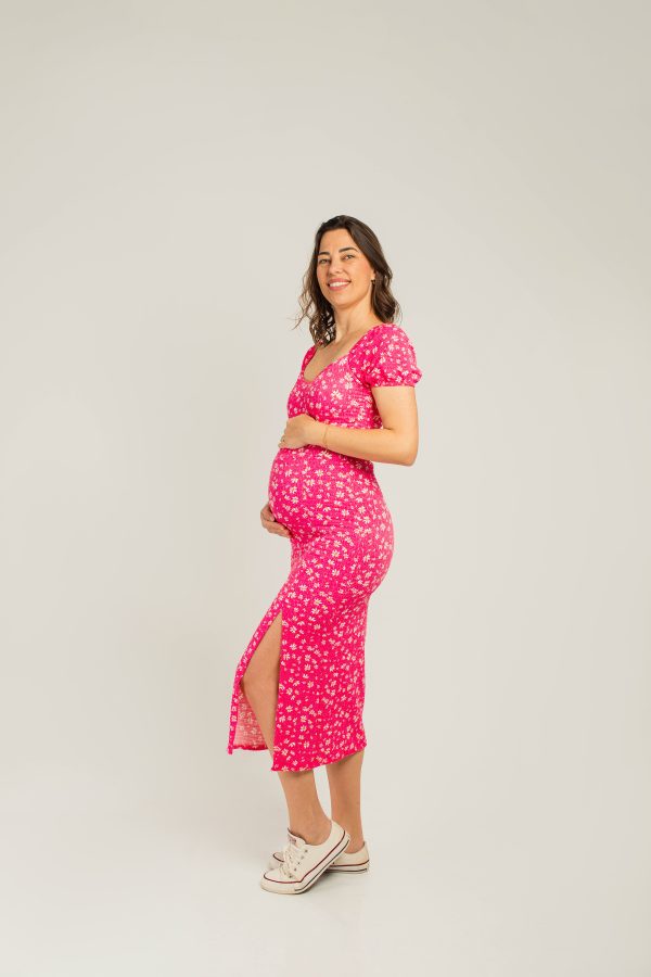 A peça conta com mangas levemente bufantes, que adicionam charme e elegância, e uma fenda profunda na lateral, que valoriza o movimento e garante um toque sensual na medida certa. O caimento fluido se adapta ao corpo durante toda a gestação, proporcionando liberdade e conforto.
