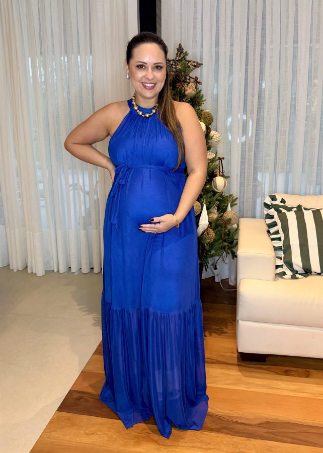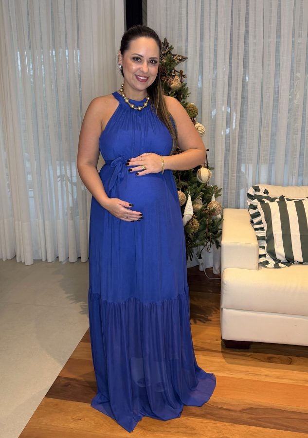 Com modelagem sem mangas e amarração no pescoço, o vestido valoriza o colo e garante um caimento sofisticado. Acompanha faixa para marcação da barriga, destacando de forma elegante as curvas da gestação.