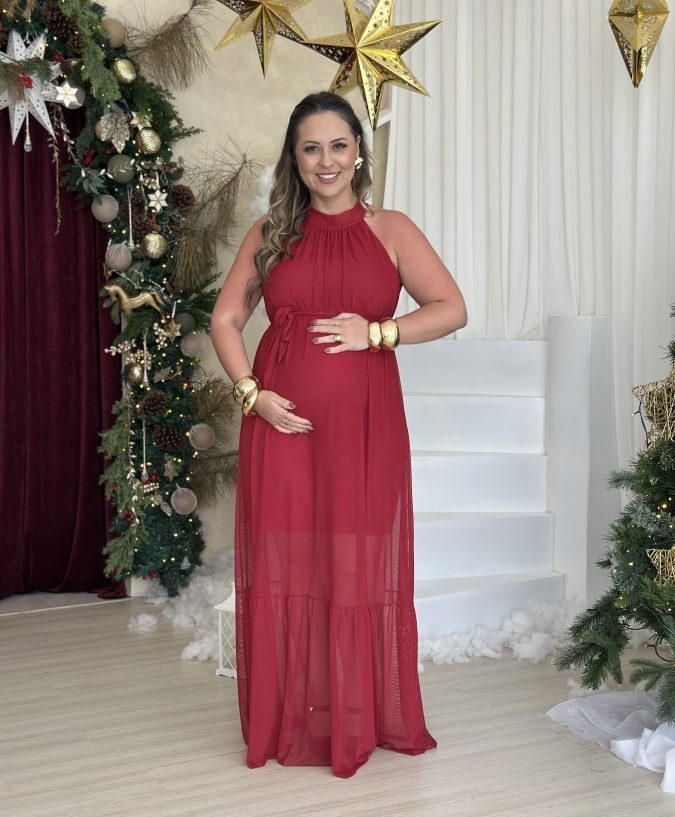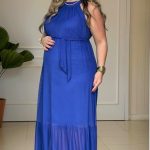 Com modelagem sem mangas e amarração no pescoço, o vestido valoriza o colo e garante um caimento sofisticado. Acompanha faixa para marcação da barriga, destacando de forma elegante as curvas da gestação.