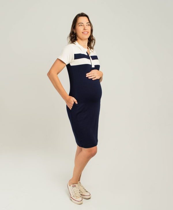 Vestido Gestante Curto Gola Polo Marinho com Detalhes em Off