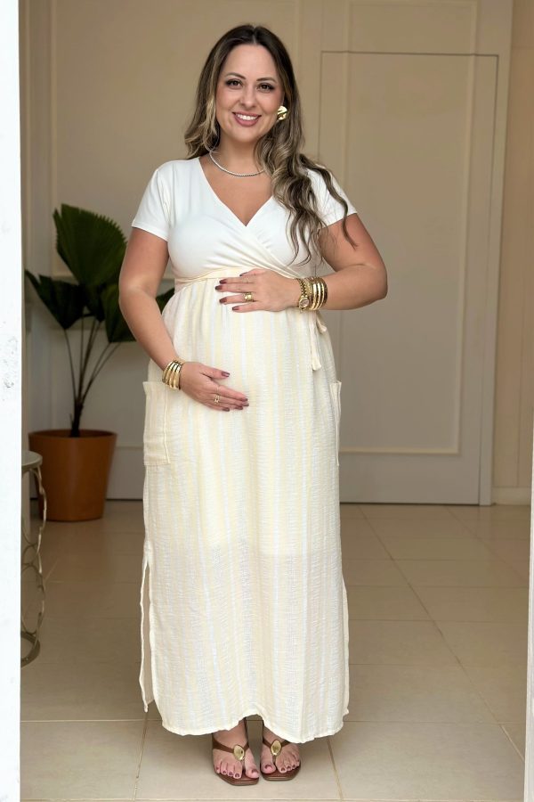 Descubra a peça perfeita para acompanhar cada momento da sua maternidade com muito charme e praticidade. Confeccionado com a combinação exclusiva de viscolaycra no busto e linho listrado na saia, este vestido une leveza e durabilidade para o seu dia a dia.