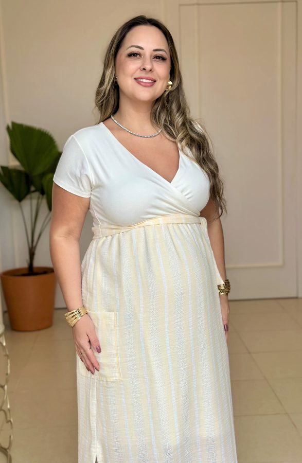 ✨ Destaques que fazem a diferença: – Decote em V elegante, que valoriza o colo; – Listras modernas na saia, trazendo um toque fashion e atemporal; – Bolsos laterais práticos, perfeitos para o que você precisar carregar; – Abertura discreta nas laterais, que facilita a amamentação com total conforto e privacidade.
