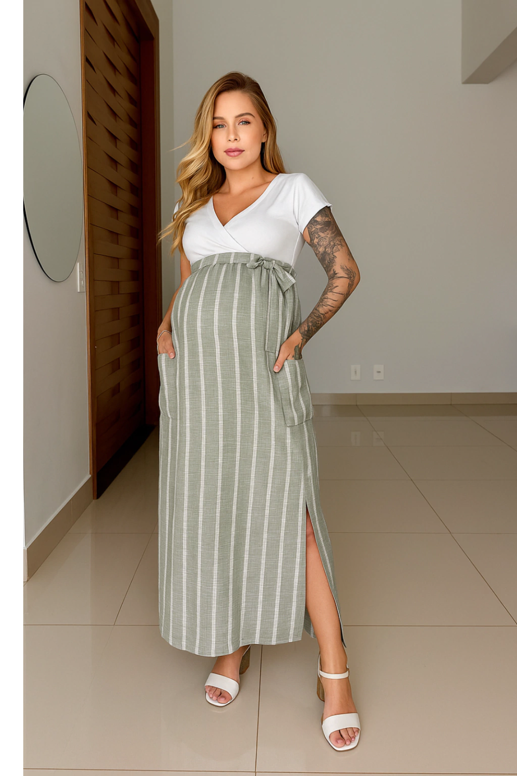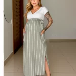 ✨ Destaques que fazem a diferença: – Decote em V elegante, que valoriza o colo; – Listras modernas na saia, trazendo um toque fashion e atemporal; – Bolsos laterais práticos, perfeitos para o que você precisar carregar; – Abertura discreta nas laterais, que facilita a amamentação com total conforto e privacidade.