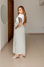 Descubra a peça perfeita para acompanhar cada momento da sua maternidade com muito charme e praticidade. Confeccionado com a combinação exclusiva de viscolaycra no busto e linho listrado na saia, este vestido une leveza e durabilidade para o seu dia a dia.