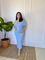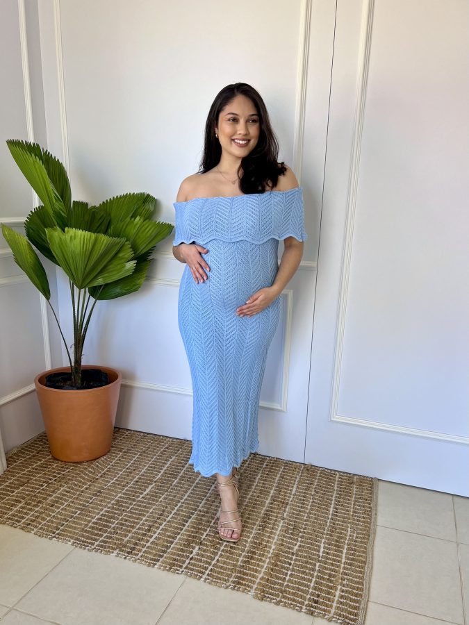Vestido Gestante Midi Tricô Ombro a Ombro Grazi Azul