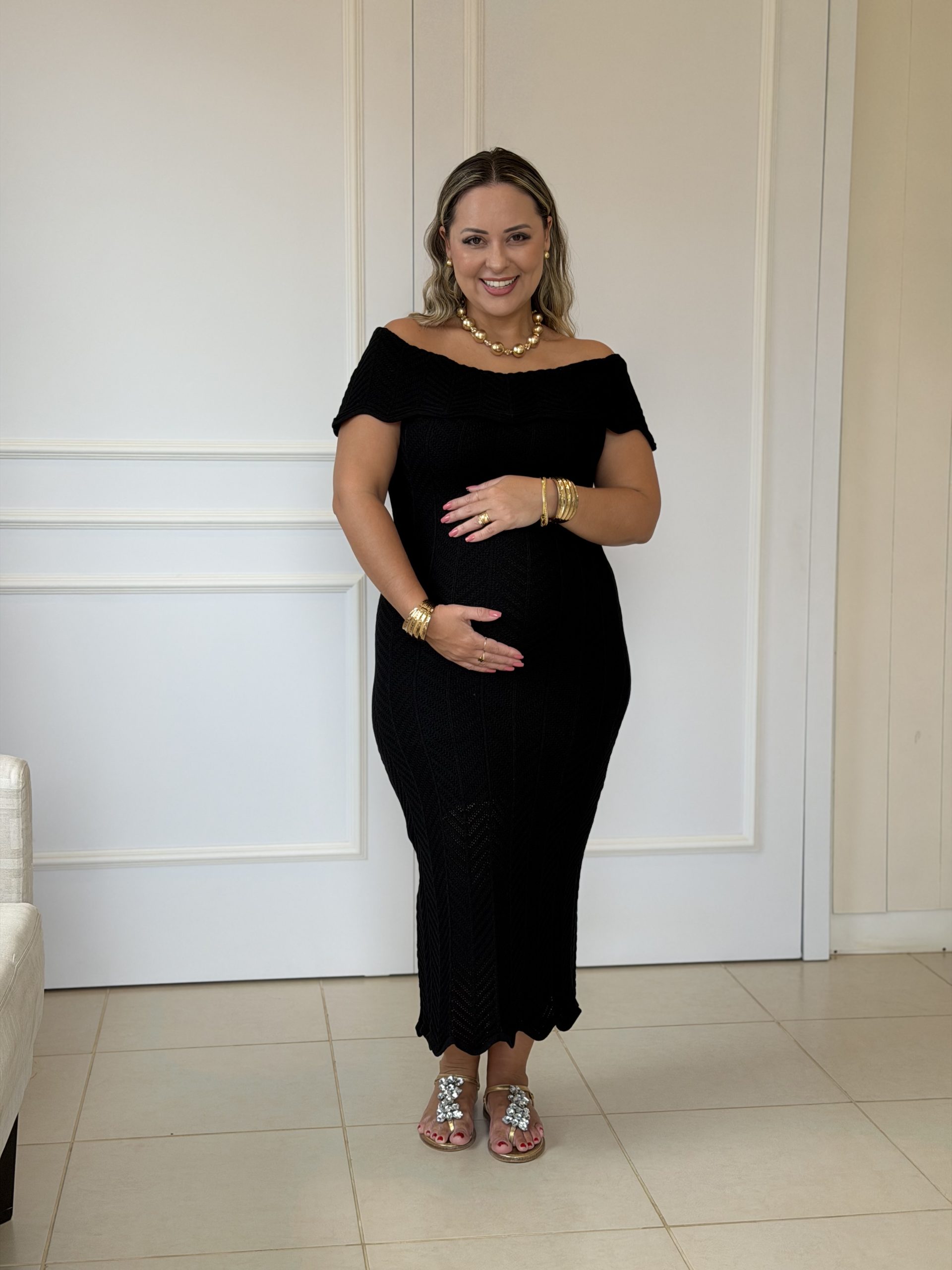 Vestido Gestante em Tricô Midi, Ombro a ombro, Com