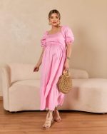 Vestido Midi, decote quadrado, com mangas bufantes. Com elastex nas costas, dando mais conforto a peça, possui um babado na saia.