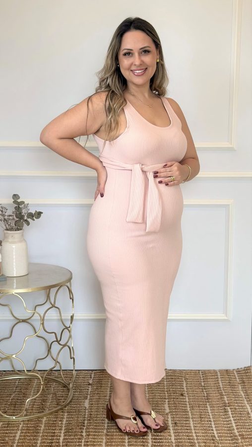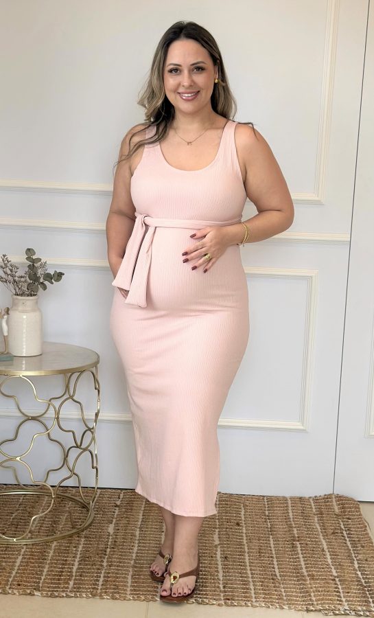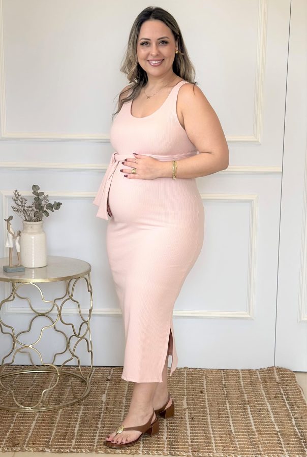 Vestido Gestante regata Canelado, com ótimo caimento e encaixe para a barriguinha, com rachas laterais. Vem com faixinha para marcar bem a barriguinha. Comprimento Midi, muito elegante, combine um saltinho, tênis ou rasteirinha e arrase.