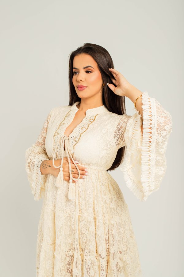 Confeccionado em renda delicada com forro, o vestido oferece caimento fluido e toque suave à pele. Suas mangas longas e amplas proporcionam movimento e elegância, enquanto a frente com amarração transpassada valoriza o busto e permite ajuste perfeito ao corpo. As costas fechadas completam o visual com equilíbrio e discrição.