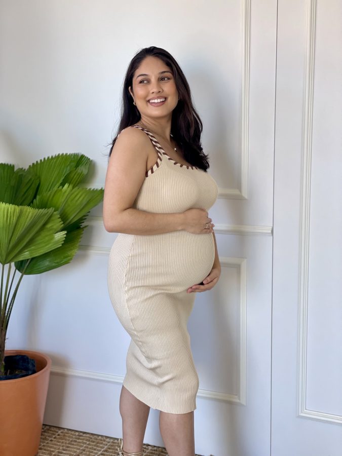 Vestido gestante em tricô tamanho único veste um P ao GG, muita elasticidade, modelo midi, com lindos detalhes traspassados nas alças.