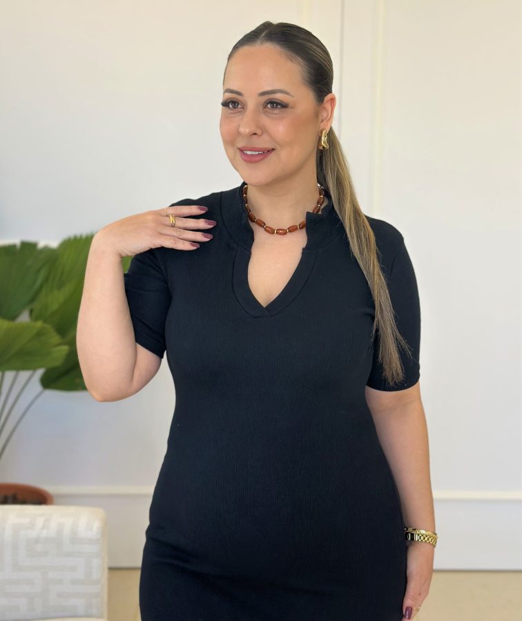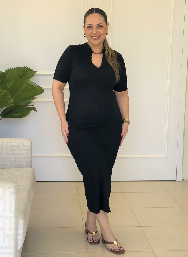 Com modelagem midi, manga curta e gola estilo polo, o vestido traz um toque moderno e elegante ao visual. A fenda lateral proporciona um charme extra e facilita os movimentos, tornando a peça ideal tanto para o dia a dia quanto para ocasiões mais especiais.